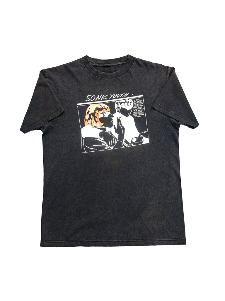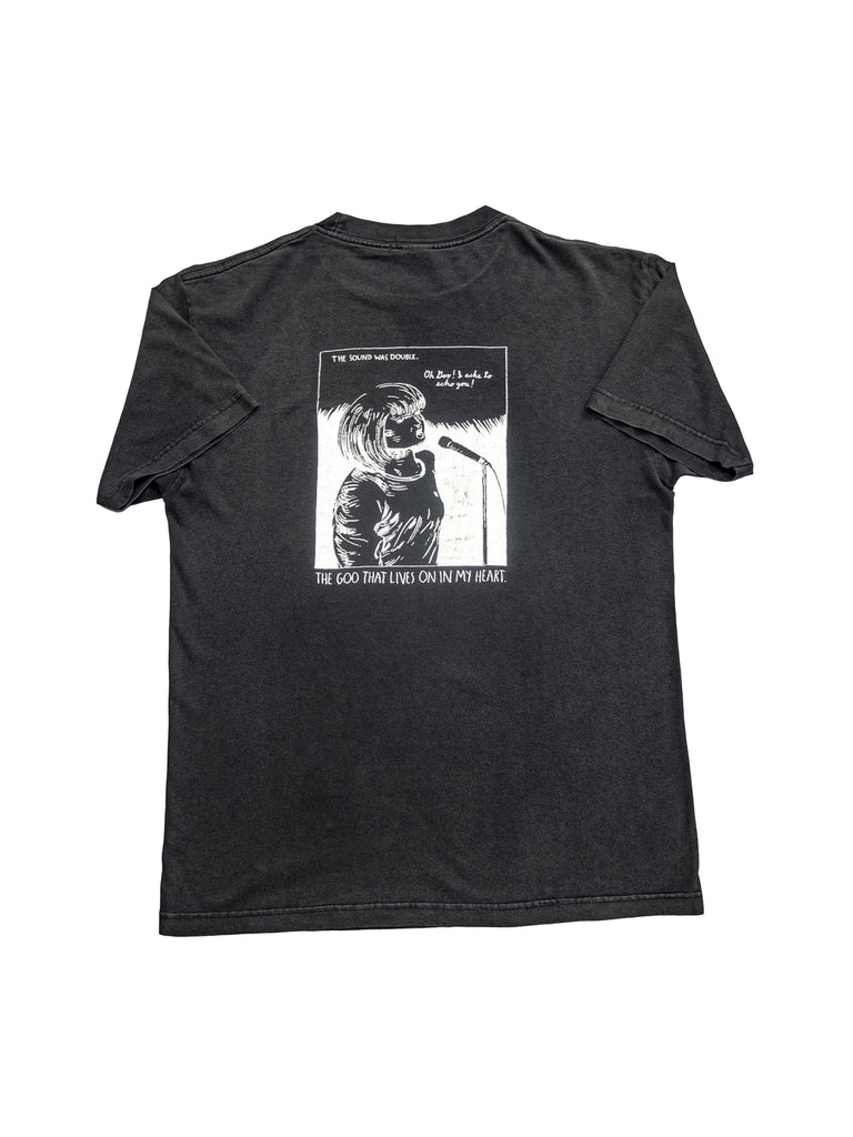 Killer double sided print for the cult rock band, featuring album cover and the 1991 Goo video artwork, by the influential Raymond Pettibon. Perfectly worn and faded 100% cotton shirt.