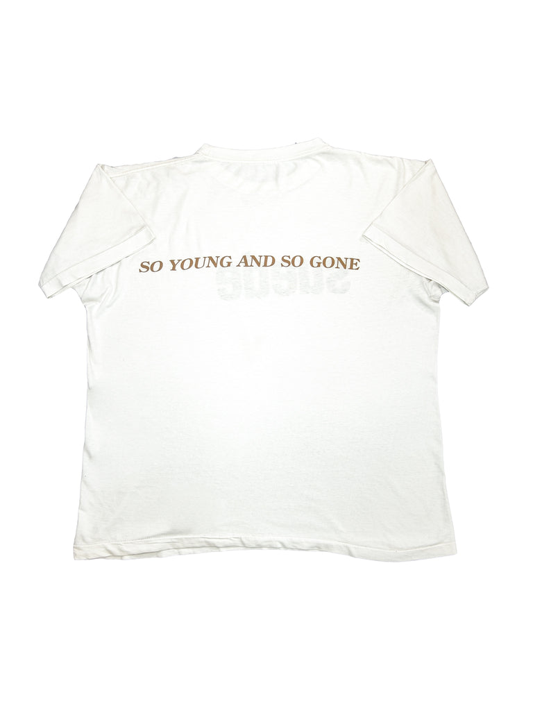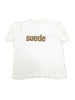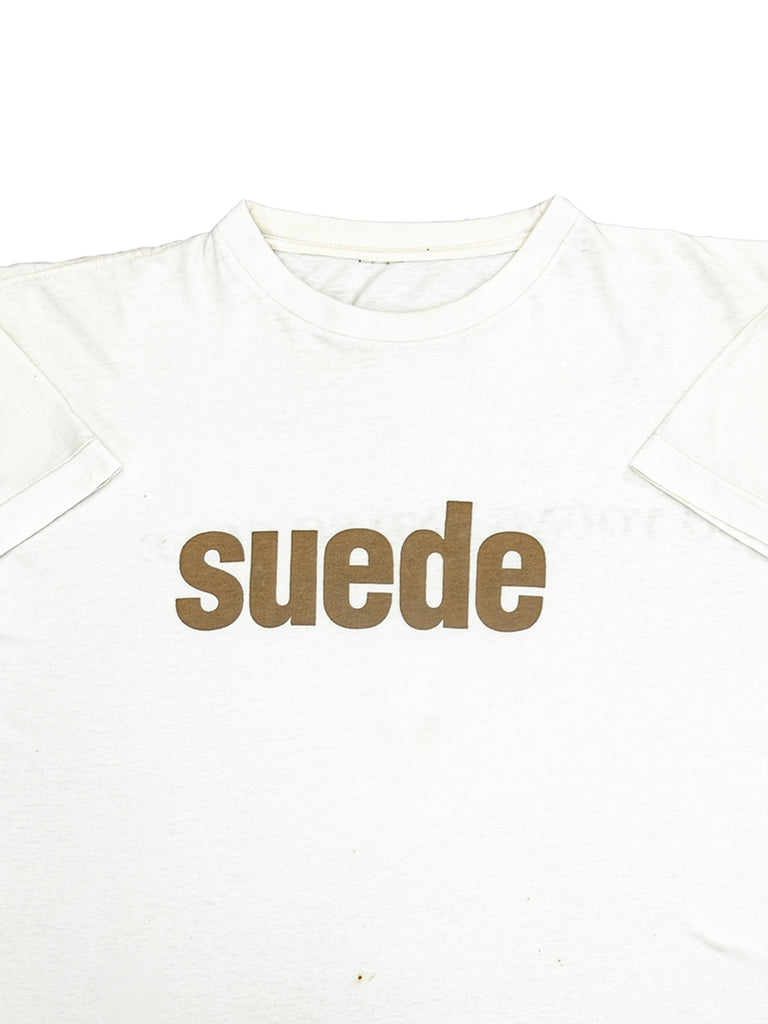 Features classic Suede logo on the front, plus great backprint with song lyric from So Young. Nice wear throughout on this 100% cotton shirt.